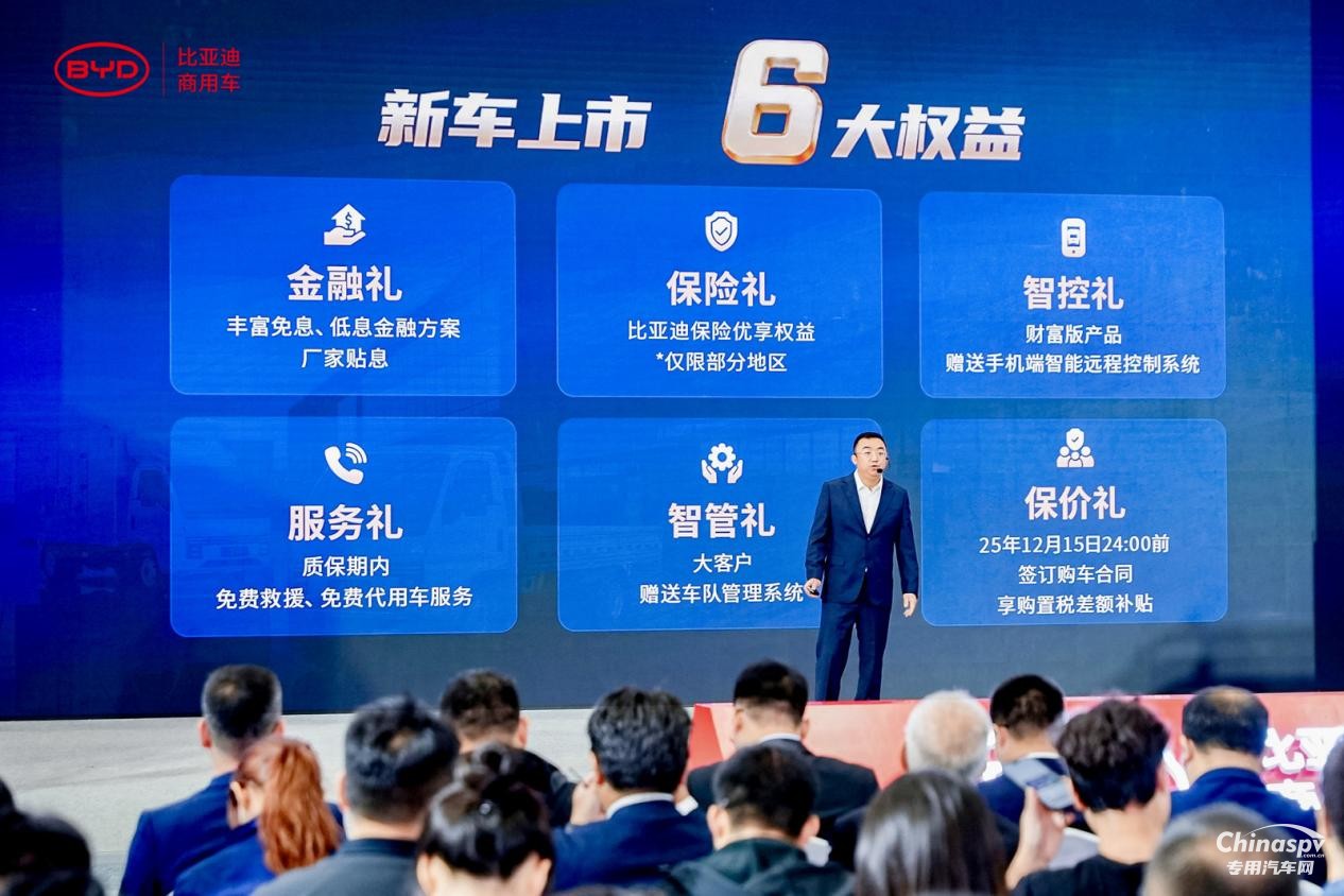为赋能物流用户,比亚迪同步推出 6 大上市权益涵盖免息金融、保险优享、免费赠送智能远程控制系统、质保期免费救援和代用车服务、大客户专属车队管理系统及购置税报价补贴,覆盖购车到运营全周期,助力低成本高效创富。同时,三电系统10年/80万公里超长质保,为物流用户打造低成本高效创富方案,推动行业绿色智能升级。