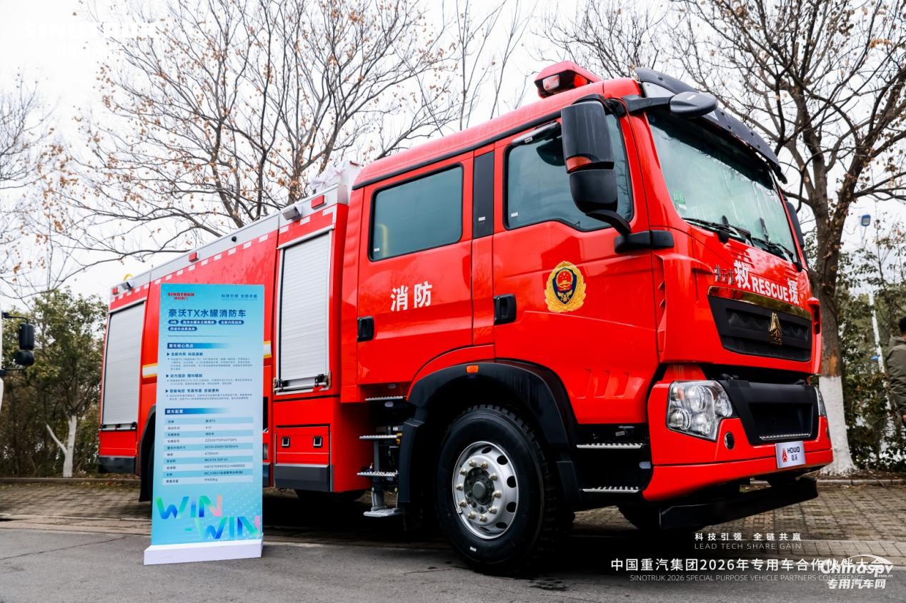 在近期开展的中国重汽集团2026年专用车合作伙伴大会上,豪沃重卡携多品类专用车产品重磅亮相,展示其全新场景化解决方案,成为全场焦点。其中,豪沃TX水罐消防车以全面实力回应现代化消防救援对高效、安全、智能的核心需求——搭载曼技术MC07H.35P-61发动机,功率提升至258kw,整车比功率高达13.2kw/t;车辆全面升级中国重汽3.0电器架构+ TX7 PRO全新内饰,配备一键启动、无钥匙进入、一键寻车、360环视、12.3吋多媒体娱乐屏、EPB 电子驻车等多项智能配置,在紧张的任务环境中为用户提供清晰的信息支持与从容的操作体验,精准贴合现代化消防装备的核心需求。