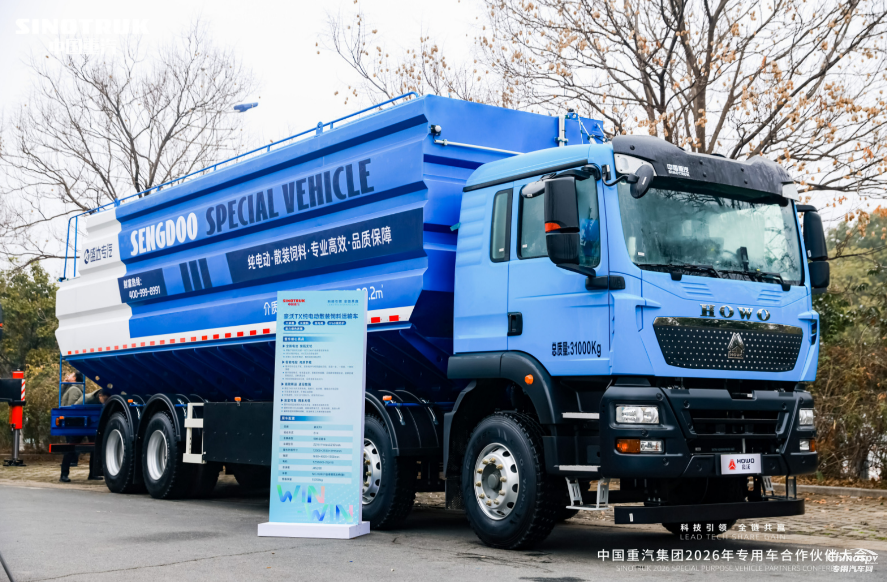 在农牧运输领域,效率与可靠同样关键。豪沃TX纯电动散装饲料运输依托中国重汽自主开发的整车控制系统,实现“一车、一场景、一控制”的精准匹配策略,让车辆在不同路况与载荷下均能保持最佳运行状态;同时配备额定340kW大功率电机,扭矩大、起步稳,重载动力响应快,还可选装寒区装甲,不惧区域环境限制,保障饲料运输全程不断链。