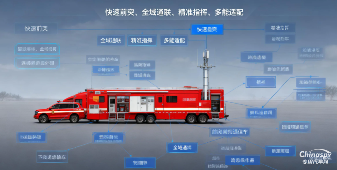 模块化设计赋能,实现“一车多用”的实战适配性。该车采用模块化设计理念,预留标准化液压、电气、通信接口,可根据应急消防、危化品处置、大型活动安保等不同场景需求,灵活置换救援设备与功能模块,适配多样化实战需求。车身科学布局器材收纳空间,采用轻量化不锈钢材质,集中收纳灭火、抢险、水域救援等核心装备,取用便捷,同时避免装备因颠簸磨损,有效提升救援效率。车内配备智能供配电系统、强光照明系统及升降照明塔,可满足夜间救援、长时间驻勤的需求,搭配ANC主动降噪、双层夹胶玻璃等配置,降低车内噪音,为指挥人员提供良好的工作环境,兼顾实战性与舒适性。
