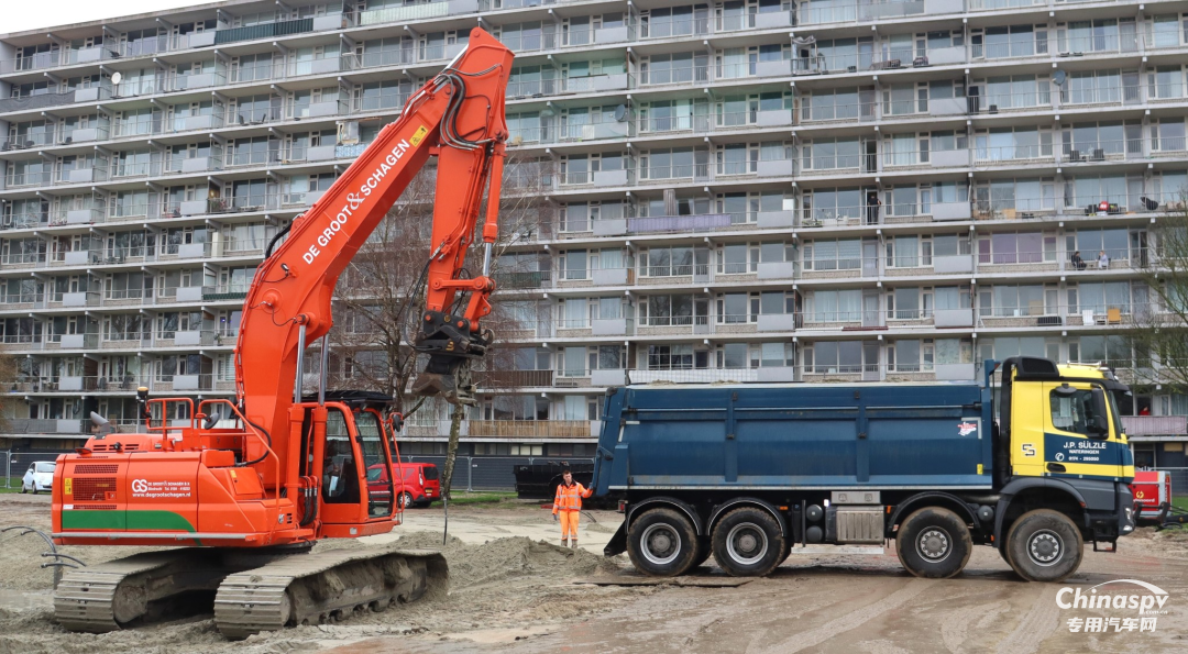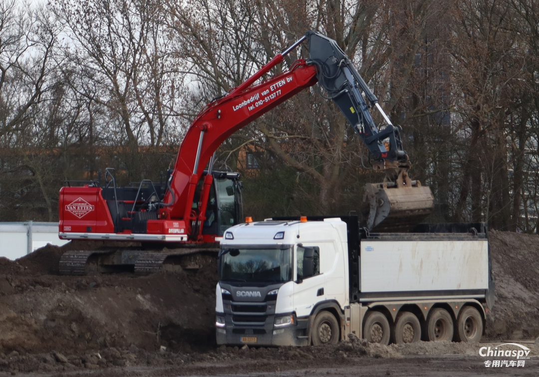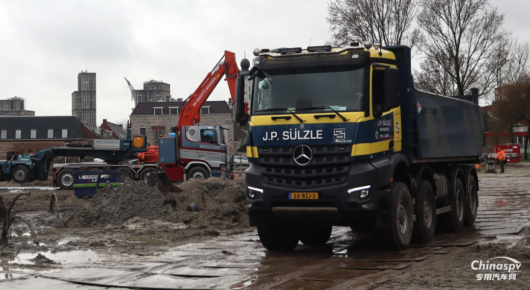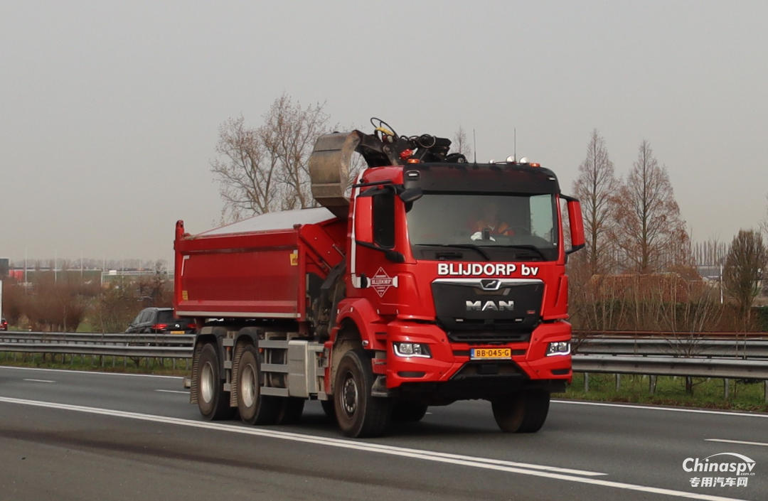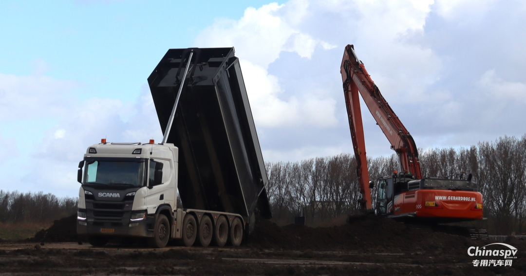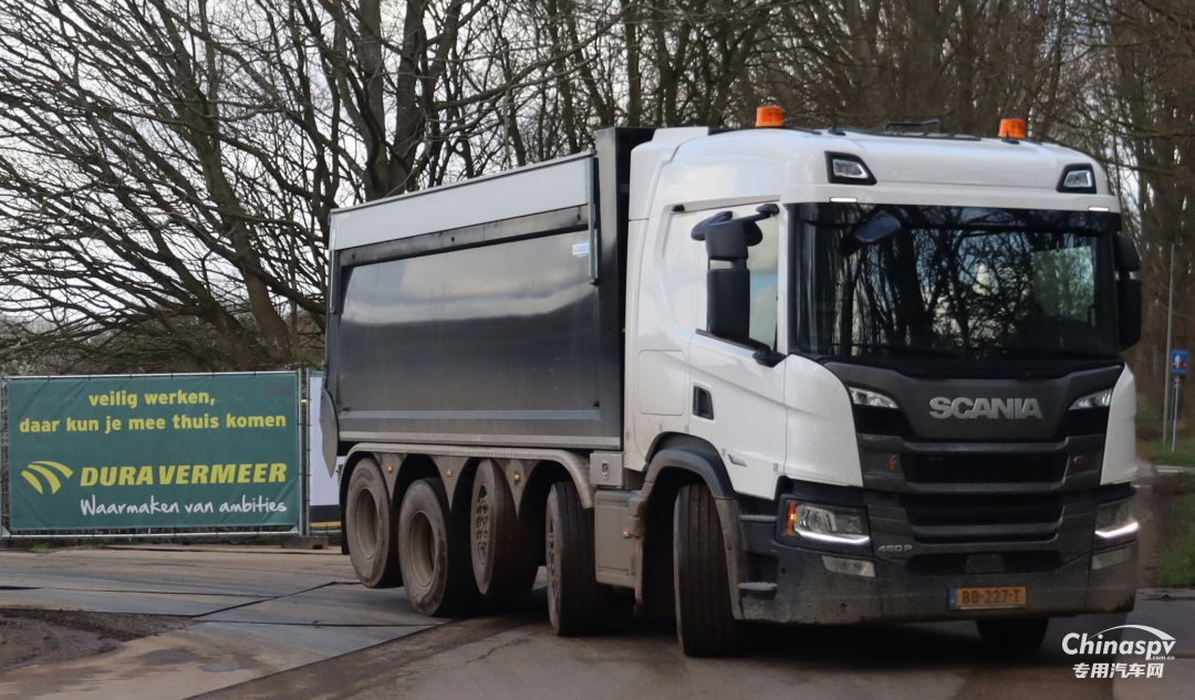 荷兰当地使用的自卸车法规规定五轴车总重49吨,在当地很多公司采用10X4驱动结构,车辆自重大约在18-19吨,每个厂家具体的自重有少许差异,这样可以满足30吨的载重需求。