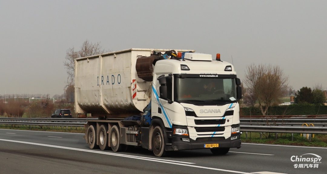 瑞典SCANIA P410 8X4自可卸底盘,采用高顶公路驾驶室,带遮阳板,采用SCANIA DC13 500发动机,L6结构,排量13升,输出460马力,扭矩2000N.M,变速箱采用SCANIA GRSO905R 14档自动变速箱,车辆外尺寸9.5X2.5X3.2M,驾驶室后部带有随车吊,自可卸垃圾箱转运上装。