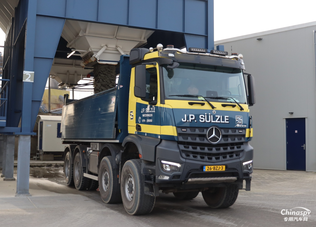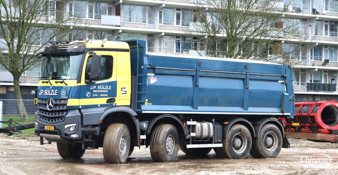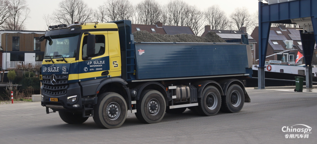 德国MERCEDES AROCS 4142 8X8自卸车,采用矩形货厢结构,前顶设计,承载强自重轻。
