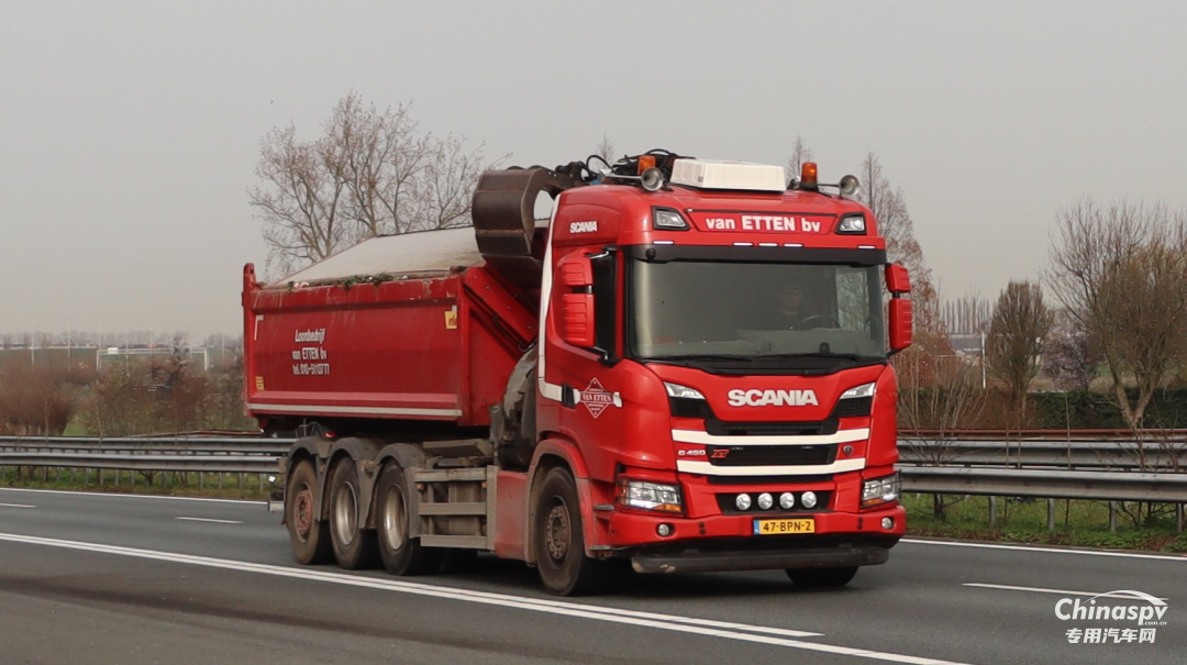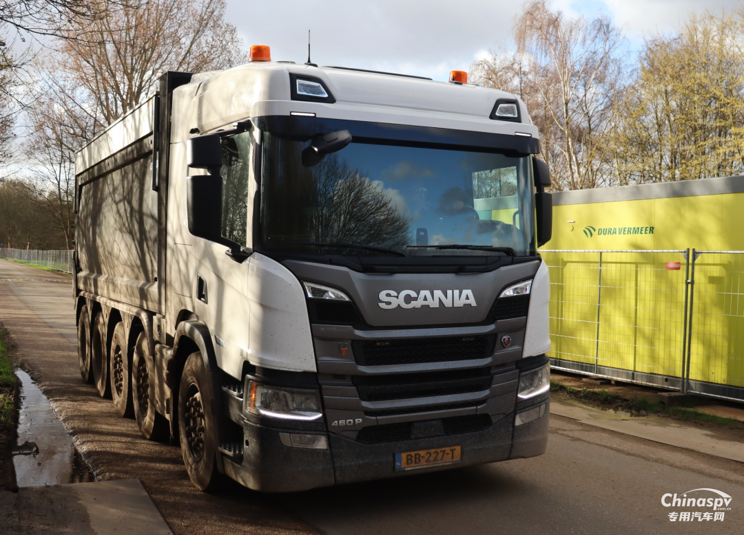 瑞典SCANIA P460 10X4自卸车,采用矩形货厢结构,前顶设计,承载强自重轻。